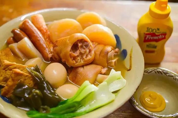 冲绳:关东煮里也有猪蹄 冲绳因为靠近闽南地区,所以是只猪就没有不能吃的地方, 比如猪蹄、猪肠、猪肝、猪耳等等......这些在日本其他地区的人看来,都是下不了口的食材,冲绳人民炖、烤、煮、炸、凉拌……吃得可欢实了! 就连关东煮里也会放上猪蹄一起炖。