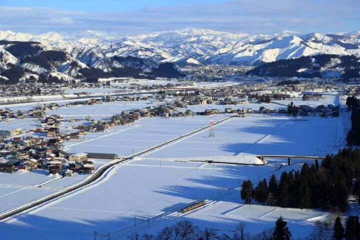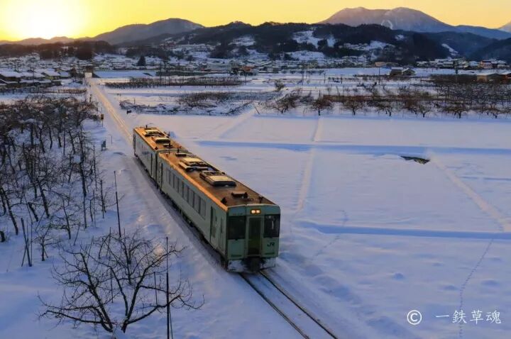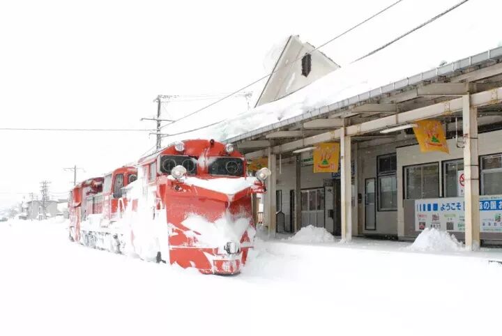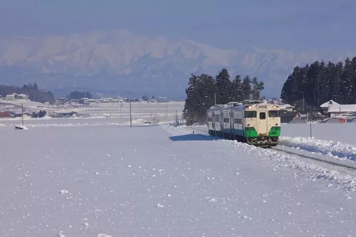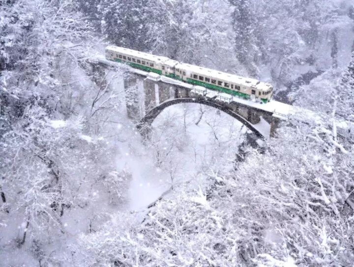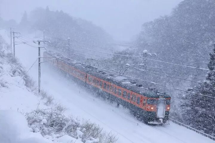 米坂线连接山形县米沢市米沢站和新泻县村上市坂町站,全长90.7km。沿线经过红叶名所赤芝峡,一到冬季下雪,这里就像水墨画里的世界,静谧有意境。
