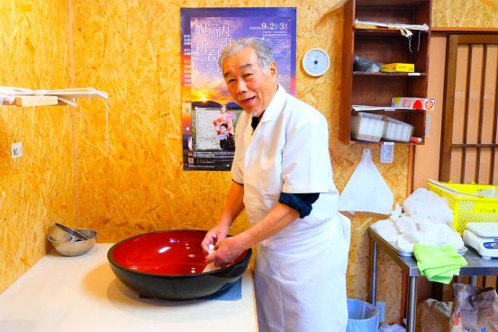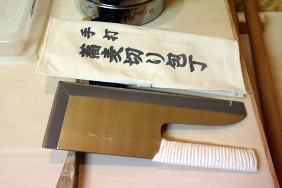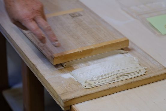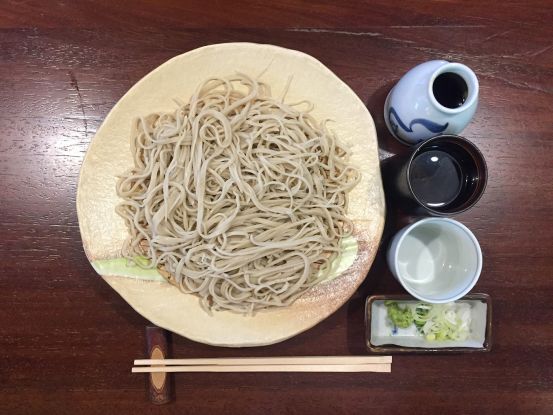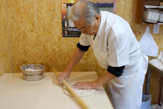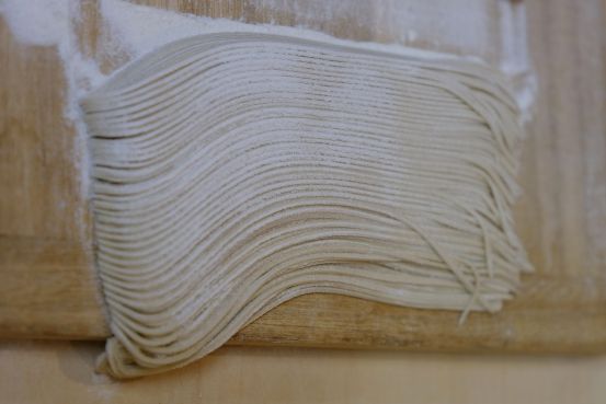 到了长野县当然要尝尝当地荞麦面,这里优质的水源,肥沃的土地,昼夜温差大的环境成就了美味的荞麦面。光吃怎么能行,还要亲手做。 将打面用的粉撒在桌面上,开始擀面。将面团擀至直径约20cm左右。 用90cm长的擀面棍,将面团擀成直径约80cm左右的面饼。最后将面折叠成能放在砧板上切的尺寸。 压上切面板开始切面,切一下,然后用刀往切面板推一下,便可继续切面。 自己做的荞麦面自己吃,将煮好的荞麦面冰镇后,把葱花和芥末放进酱油里面,然后调和,再把冷面沾上酱汁,带着葱花的香气配搭芥末的刺激感。自己做的荞麦面就是好吃!