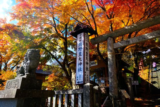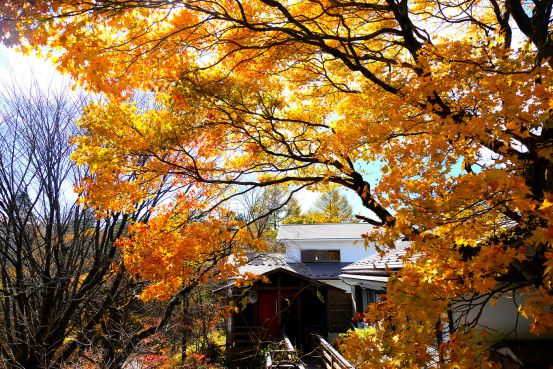 美好的度假胜地美好的度假胜地:长野县轻井泽 轻井泽对于长野市民来说,是一个时髦别致的小旅行的好去处。现在的日本天皇便是在轻井泽邂逅了他的妻子,约翰列侬和小野洋子当初也经常来这里度假。轻井泽的森林、湖泊、瀑布也一直吸引着很多游客。在长野站坐上新干线,只用半个小时就能开启轻井泽之旅。距离东京也只有1个多小时的车程! 春天樱花绽放, 夏天绿树成荫, 秋天枫叶飘落, 冬天白雪皑皑。 有这样一句话: 如果有对象的,就在轻井泽铭记爱情, 还没有遇见爱情的, 就到轻井泽来场浪漫的邂逅吧! 这座位于日本长野县和群马县县界的神社——轻井泽熊野皇大神社,就让我们感到了意外的浪漫!跨越两县的神社很稀有,而且这里的红叶非常美丽。 枫叶从绿油油到黄橙橙再到红彤彤,然后从鲜红再到深红色互相映衬着。 枫叶红色,层林尽染,秋天习习,落叶如蝶,沙沙作响,无需去形容它有多美。 枫叶像一个个小星星布满在晴空下,陶醉在秋日的童话里。 神社里这棵树也非常有名叫しなの木,据说在这里祈福,祝愿十分灵验。从这个角度还可以看到一个爱心的形状哦。漫步枫树下,细细欣赏,感受秋日醉人的画面,好好记着这秋日的童话景象。