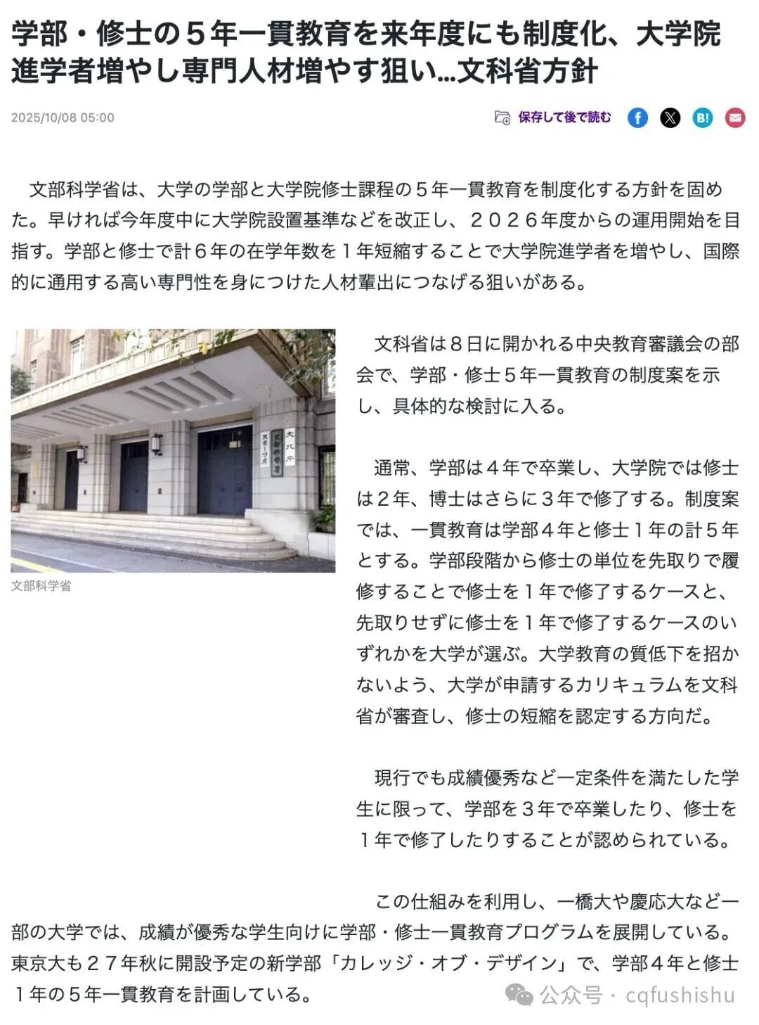 其实,在一些顶尖大学,比如东京大学、一桥大学、庆应大学等,已经存在「早期修了(そうきしゅうりょう)」制度。成績優秀者(成绩优异的学生)可以在本科后直接衔接研究课程,最快5年内拿到硕士学位。但过去这种做法**于少数学校、少数学生。而新制度将让更多大学可以引入这种模式,意味着未来这种“5年一贯修完”的课程会普及化。这次改革的重点是——从2026年度起正式实施。也就是说: 2026年4月入学 的学生(也就是现在语校或在国内备考的同学),将可能是**批可以选择一贯制课程的学生!关注大学官网、入试要项中的「一貫制コース」或「修士早期修了プログラム」字样;特别是国公立大学、研究型大学,会率先试点。想进入研究课程,日语理解力和学术表达能力都非常关键。建议在高中阶段就开始系统准备JLPT考试,目标为N1(至少N2)。新的5年一贯制更偏向“研究导向”培养。在升学规划时,建议学生在高中后期就确定感兴趣的领域(比如AI、设计、教育、国际关系等),并拿到英语托福或托业的较高的成绩或积累小型研究经验。 这项“学部・修士5年一贯制”的改革,是日本近年来最受关注的教育政策之一。对希望孩子在日本深造的家庭来说,这意味着:因此——现在正是提前规划的关键阶段。如果您的孩子计划2026年或之后赴日升学,建议尽早进行以下准备:富士塾学校帮助学生与家长了解不同大学的对应政策与申请条件。请电话咨询我们吧!声明:素材来源于公开网络。如发现内容涉及版权问题,烦请与我们联系,我们将**时间核实并进行删除处理。感谢您的理解与支持。